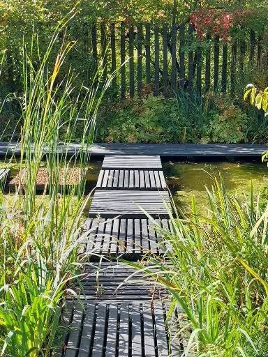 Mien Ruys introduceerde ook de grindtegel en gebruikte bielzen in haar tuinen.